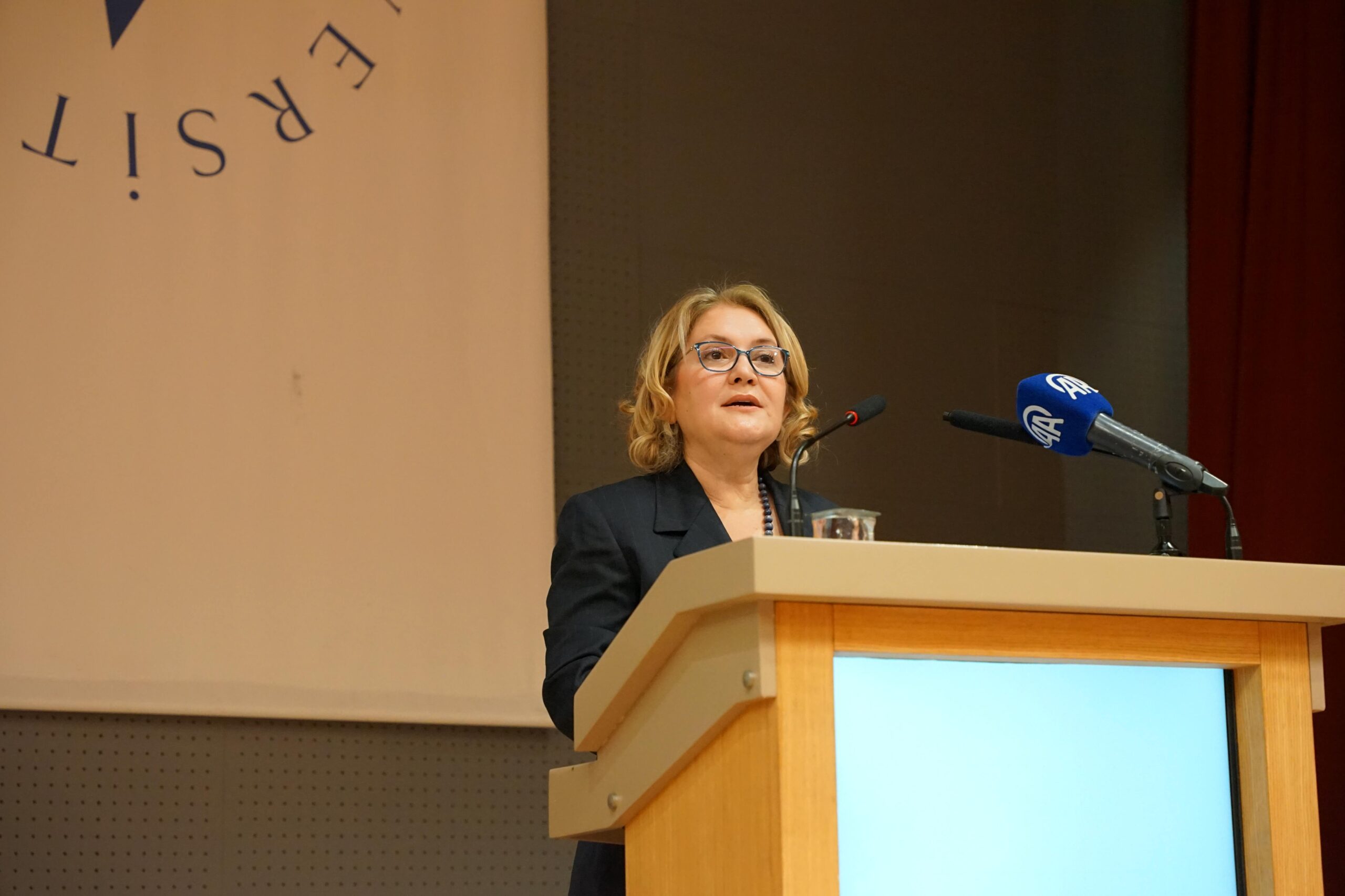 Mühendislik ve Doğa Bilimleri Fakültesi Dekanı Prof. Dr. M. Burcu Irmak Yazıcıoğlu, açılış konuşmasında yapay zekanın özellikle son 10 yılda hayatımızın her alanına girdiğini belirterek “Kullandığımız akıllı cihazların arama motorlarından yaptığımız geçmiş aramalara bulunduğumuz lokasyona, alışverişlerimiz ve diğer çevrimiçi hareketlerimize dayanarak bizlere kişiselleştirilmiş öneriler sunması, kullandığımız akıllı telefonların kişiselleşmiş hizmet sunmak için sanal asistanların kullanılmasına olanak sağlaması, web aramalarında geniş veri girdilerine bakarak ilgili arama sonuçlarını önümüze serilmesi, her gün hepimizin kullandığı navigasyonlar, sosyal medyadaki bilgilerin taranarak endişe verici kelimelerin bulunup sahte haber ile dezenformasyonun tespit edilmesi yapay zekanın tam da hayatımızın içinde olduğunun göstergesine örneklerdir” dedi.