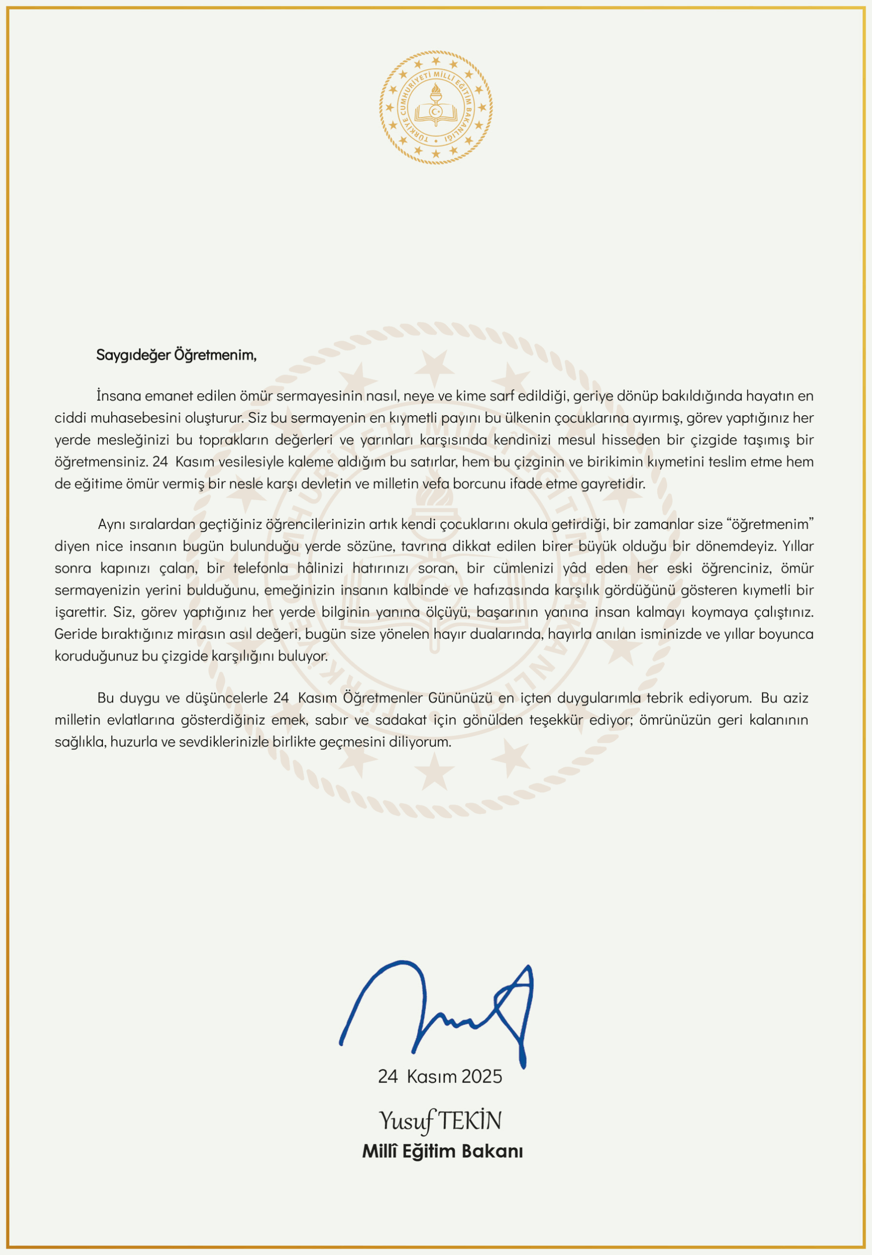 T.C Milli Eğitim Bakanı Yusuf Tekin Öğretmenler Günü dolayısıyla ülke genelindeki tüm öğretmenlere ve tarafımıza gönderdiği SMS mesajında “İyi ki varsın ogretmenim! 24 Kasım Ogretmenler Gunu’nuzu ekteki mektubumla kutluyorum” dedikten sonra verdiği Linkteki mektubunda şunları yazdı: