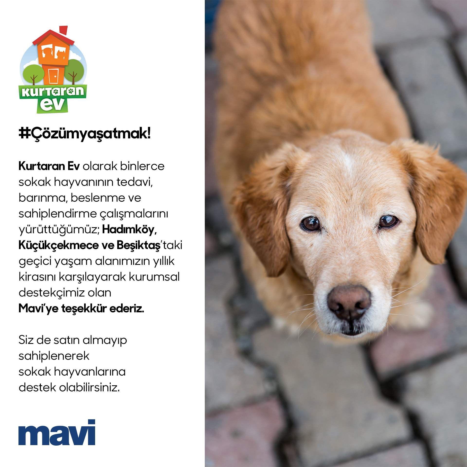 Türkiye’nin öncü jean ve hazır giyim markası Mavi, yardıma muhtaç̧ hayvanlara sahiplenilecekleri ana kadar geçici yaşam alanı sunan Kurtaran Ev’in kurumsal destekçisi oldu. İş birliği kapsamında Mavi, binlerce sokak hayvanının tedavi, barınma, beslenme ve sahiplenme çalışmalarının yürütüldüğü, Hadımköy, Küçükçekmece ve Beşiktaş’taki geçici yaşam alanlarının yıllık kirasını karşıladı.