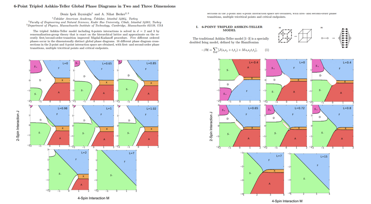 “6-Point Tripled Ashkin-Teller Global Phase Diagrams in Two and Three Dimensions” başlıklı makalede, iki ve üç boyutlu sistemlerde tripled Ashkin-Teller spin modeli ele alınarak, farklı etkileşim türlerinin oluşturduğu küresel faz diyagramları kapsamlı biçimde analiz ediliyor. Araştırma; birinci ve ikinci dereceden faz geçişleri, çoklu trikritik noktalar ve kritik uç noktalar gibi karmaşık fiziksel yapıların incelenmesiyle, sistemlerin davranış dinamiklerine ilişkin önemli bulgular ortaya koyuyor. Elde edilen sonuçlar, teorik fizik ve istatistiksel mekanik alanlarında temel modellerin daha derinlemesine anlaşılmasına katkı sunarken, çalışma bu yönüyle uluslararası akademik literatürde yüksek bilimsel değer taşıyan bir referans olarak öne çıkıyor.