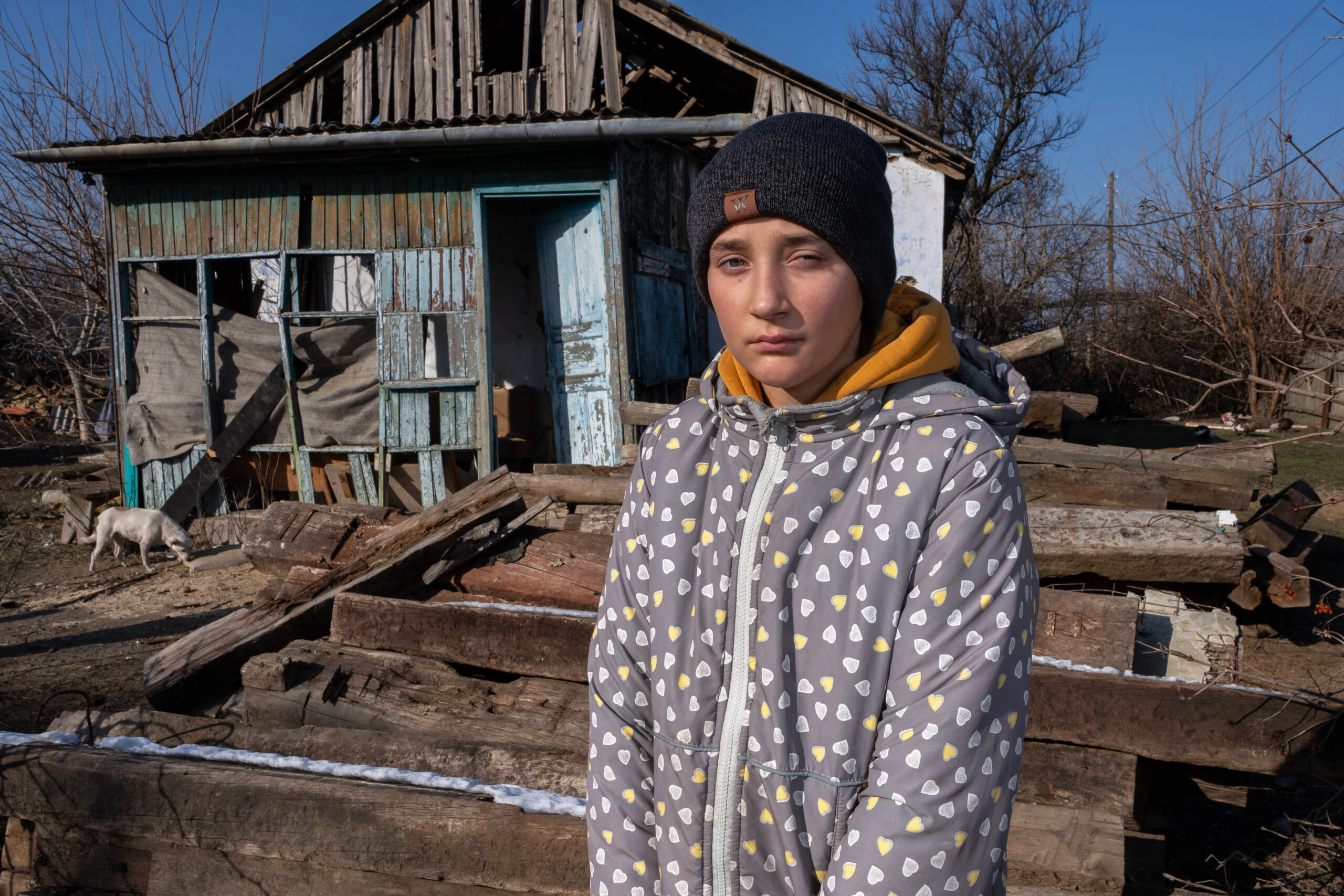 Yana, 14, draws water from a well near her destroyed home in the village of Kobzartsi, Mykolaiv region, which was heavily damaged during the early days of the full-scale war.