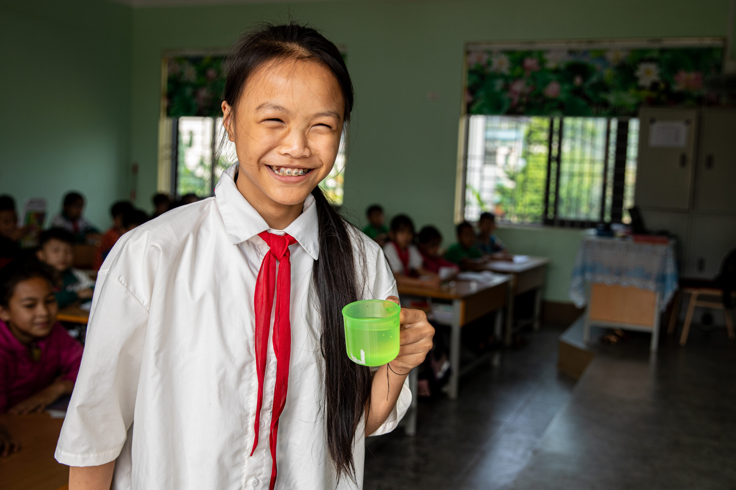 24 April 2025, Điện Biên province – Lò Thị Bảo Vy, 10, drinks clean water at Bình Minh Primary School, one of the schools equipped with a UNICEF-supported rainwater harvesting filter system.