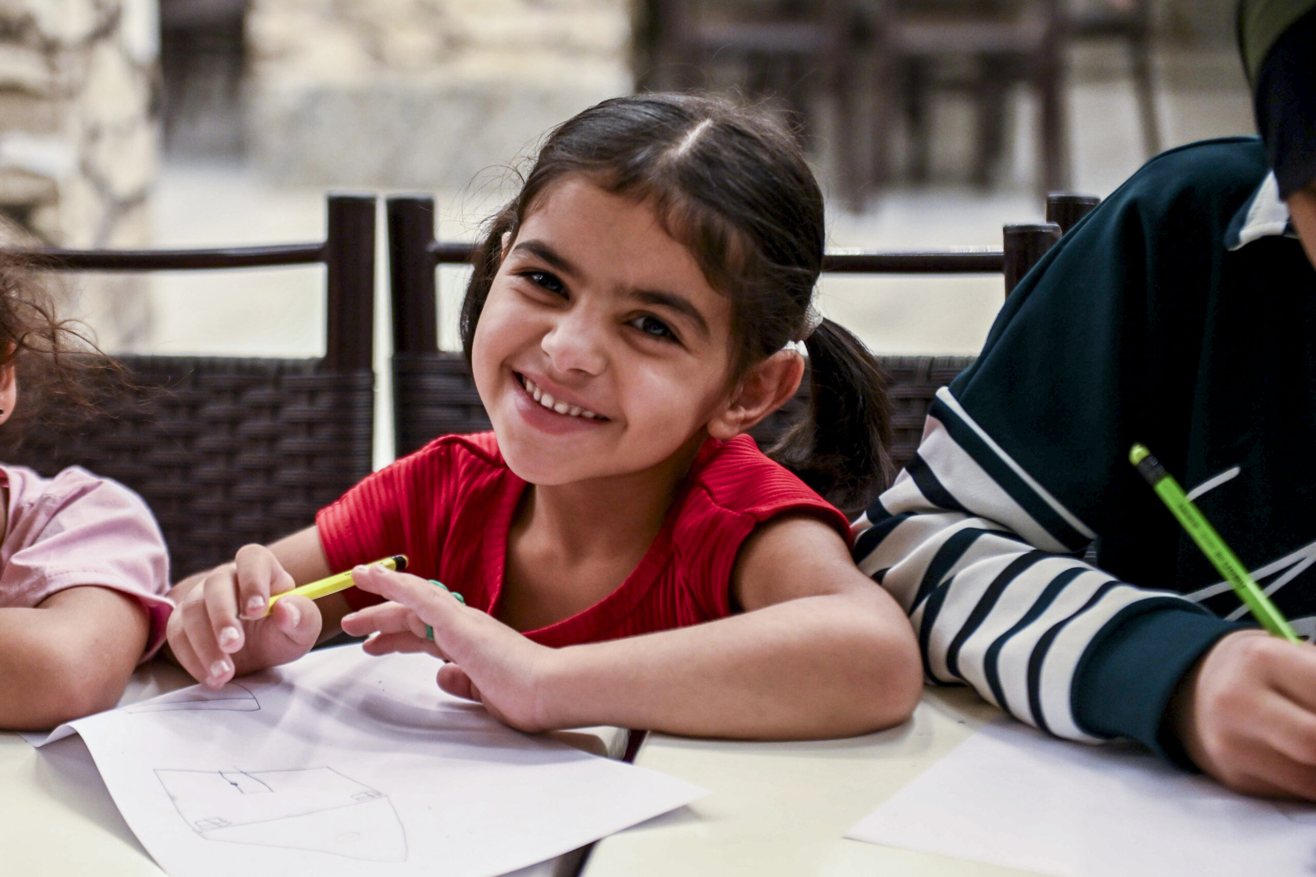 Yakeen, 5, participates in a drawing activity provided by a UNICEF-supported child protection team at a shelter in Sayyeda Zeinab, Rural Damascus, Syria on 2 September 2025.
