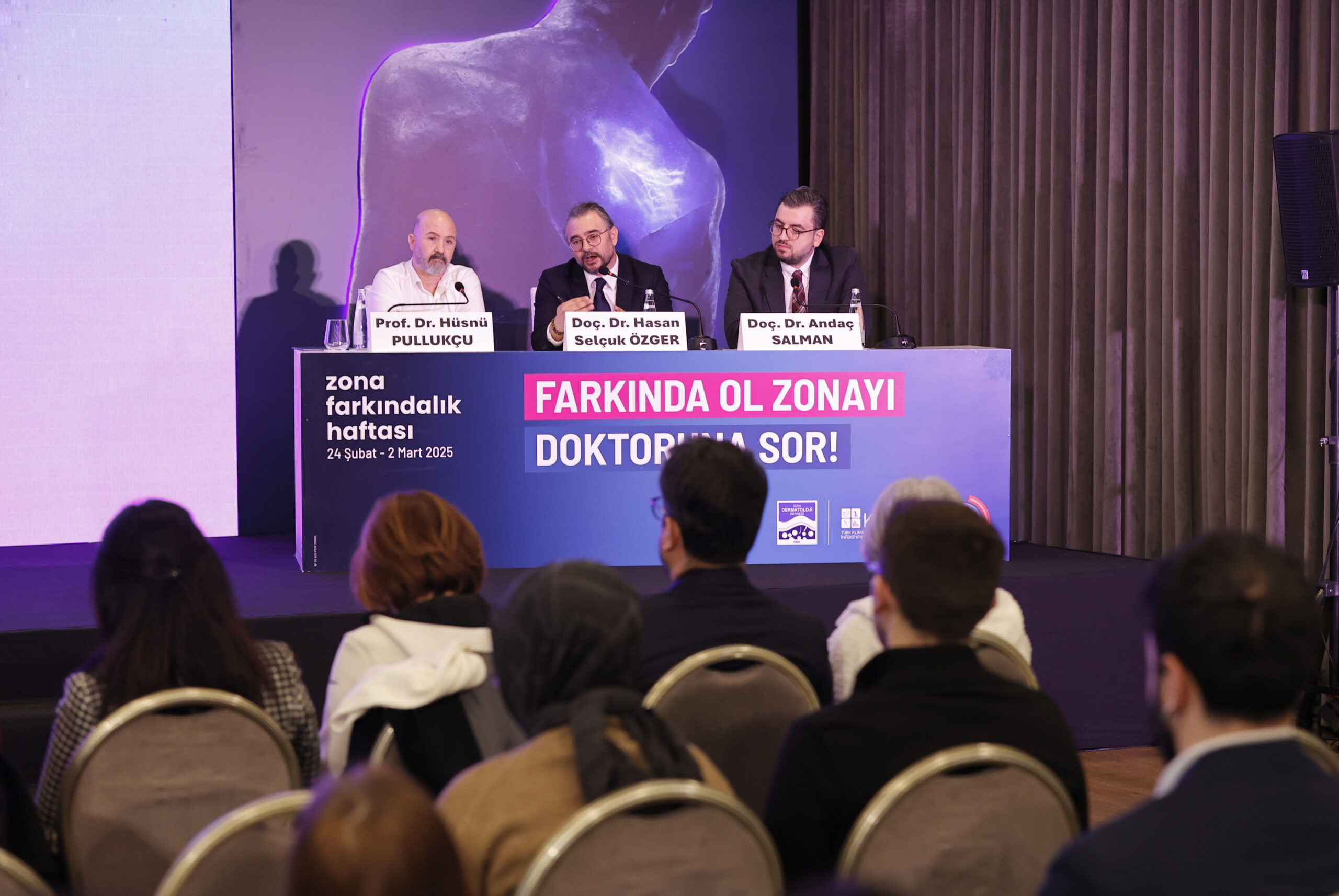 Türkiye Enfeksiyon Hastalıkları ve Klinik Mikrobiyoloji Uzmanlık Derneği (EKMUD) Yönetim Kurulu Başkanı Prof. Dr. Hüsnü Pullukçu, Türk Dermatoloji Derneği Yönetim Kurulu Üyesi Doç. Dr. Andaç Salman ve Türk Klinik Mikrobiyoloji ve İnfeksiyon Hastalıkları Derneği (KLİMİK) Yönetim Kurulu Üyesi Doç. Dr. Selçuk Özger’in ilgili dernekleri temsilen yer aldığı etkinliğin moderatörlüğünü değerli gazeteci Mirgün Cabas üstlendi. Katılımcılara zona hastalığı hakkında önemli bilgilerin aktarıldığı toplantıda Türk Klinik Mikrobiyoloji ve İnfeksiyon Hastalıkları Derneği (KLİMİK) Yönetim Kurulu Üyesi Doç. Dr. Selçuk Özger, “Toplumda 50 yaş üzerindeki bireylerin risk grubunda olduğu ve en az 3 kişiden 1’inin yaşadığı zona hastalığı, yaşa bağlı azalan bağışıklıkla kendini gösterebiliyor.” derken, Türkiye Enfeksiyon Hastalıkları ve Klinik Mikrobiyoloji Uzmanlık Derneği (EKMUD) Yönetim Kurulu Başkanı Prof. Dr. Hüsnü Pullukçu “Yetişkinlerin yüzde 90’ı zonaya neden olan virüsü vücudunda barındırıyor. Yaşla birlikte azalan bağışıklığı bir fırsat bilen zona, sinir yolu boyunca şerit halinde ortaya çıkan döküntülere ve ağrıyasebep oluyor.” ifadelerini kullandı. Türk Dermatoloji Derneği Yönetim Kurulu Üyesi Doç. Dr. Andaç Salman ise “Bu kampanya ile toplumda bilinç düzeyini artırmaya hedefliyoruz. Yaşanmadıkça veya şahit olunmadıkça göz ardı edilen bu hastalığın ciddiyetini anlayalım ve başımıza gelmeden hekimlerimize danışmayı ertelemeyelim” dedi.